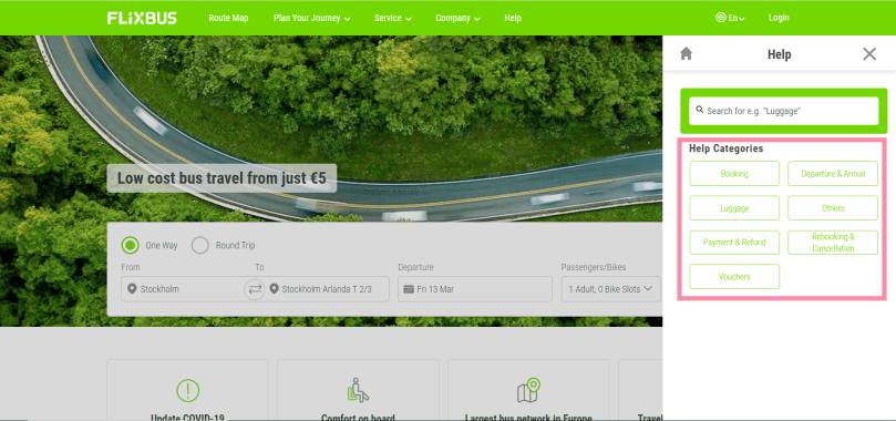 On Flixbus’s website you are required to search the help by yourself and if you finally can chat with the agent it’s not helpful but the way to find the clues to solve the problems can easily be found. When accessing the website, click “Help” from the bar in the header.